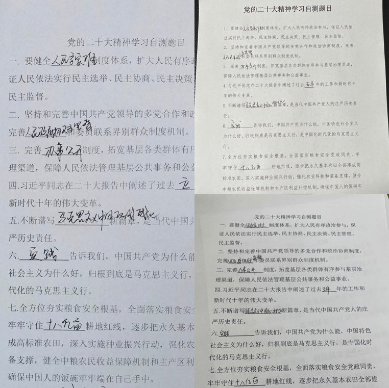 開展答卷測試,檢驗學習成效。招標咨詢集團第三黨支部所屬咨詢中心采取線上視頻會議的方式組織全體黨員居家學習黨的二十大報告原文,通過學原文、悟原理、反復學、時常悟,深刻領會和準確把握報告的精神實質、豐富內(nèi)涵和核心要義。同時,對黨的二十大報告相關知識開展應知應會測試,通過答卷的方式檢驗黨員干部對黨的二十大精神的理解和把握,達到以考促學、以學促用、學用結合、知行合一的目的。