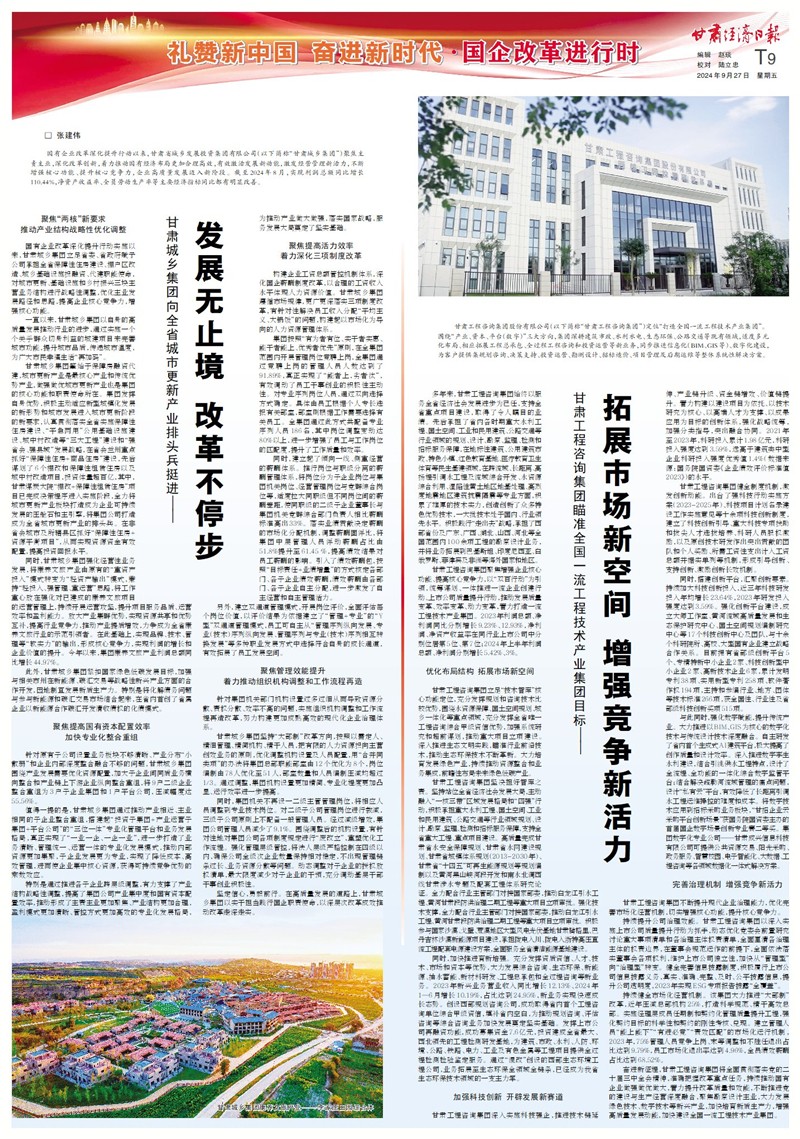 奮進新征程,甘肅工程咨詢集團將全面貫徹落實黨的二十屆三中全會精神,準確把握改革重點任務,持續推動國有企業做強做優做大,著力提升改革質量和效能,不斷推進黨的建設與生產經營深度融合,聚焦勘察設計主業,大力發展綠色技術、數字技術等新興產業,加快培育新質生產力,增強高質量發展動能,加快建設全國一流工程技術產業集團。