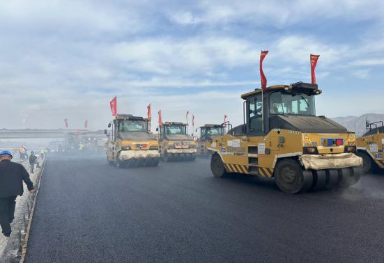 田間的風醇厚柔潤,壓路機上隨風飄搖的旗幟迸發出一陣陣吶喊聲,為道路瀝青中面層鋪筑加油助威。