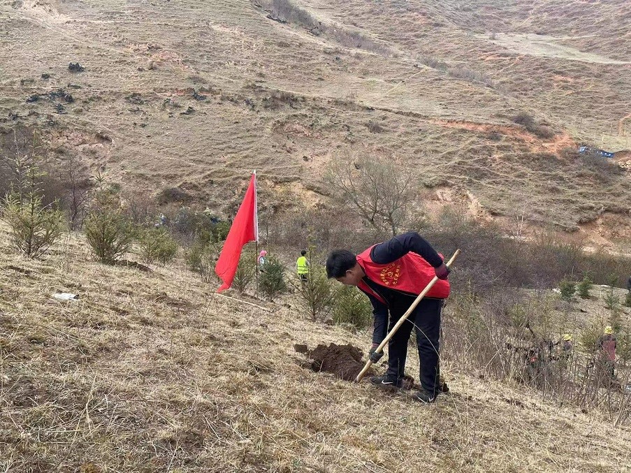 植樹現場,黨旗招展,有的揮鍬鏟土,有的扶樹填坑,有的澆水灌根,大家分工合作,默契配合,干勁十足,認真完成每一道工序。在大家的共同努力下,由交通監理公司運送的800余棵云杉樹苗迎風挺立,為馬旦溝村再添一抹新綠。