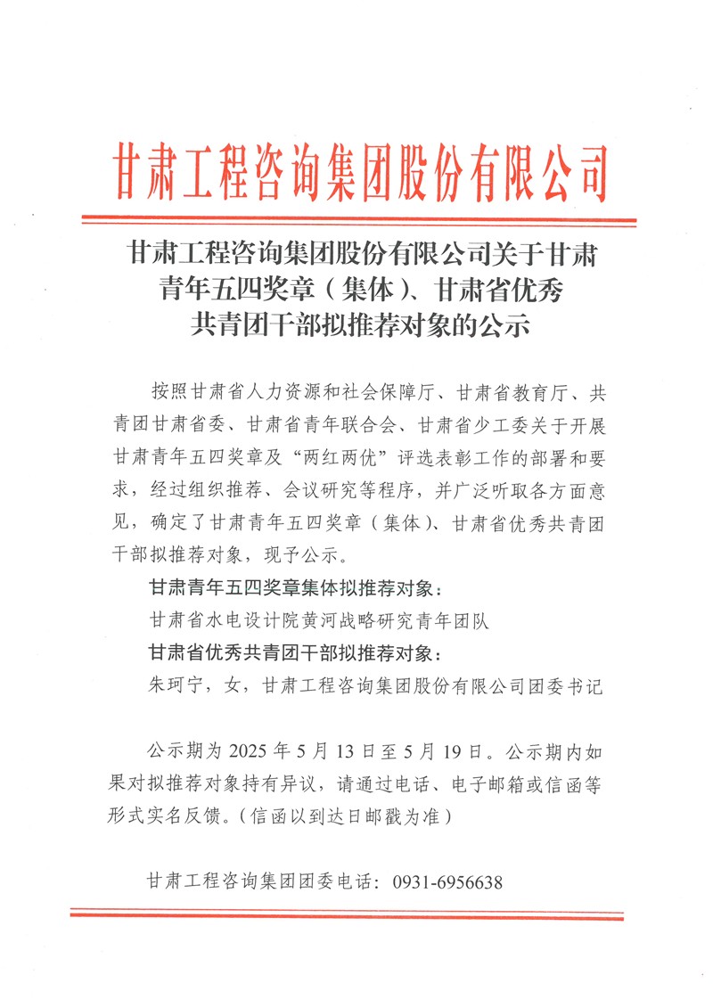甘肅工程咨詢集團(tuán)股份有限公司關(guān)于甘肅青年五四獎(jiǎng)?wù)拢w)、甘肅省優(yōu)秀共青團(tuán)干部擬推薦對象的公示