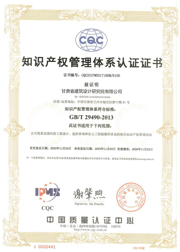 近日,省建筑設計院收到由中國質量認證中心頒發的編號為CQC23IPMS0171ROM/6100的《知識產權管理體系認證證書》,標志著省建筑設計院知識產權管理體系完全符合GB/T 29490-2013標準,這是省建筑設計院在國家層面知識產權領域取得的重要認可,進一步提升了省建筑設計院的綜合競爭力。